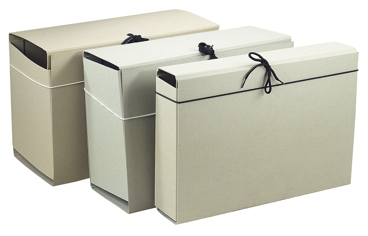 תיק מקרטון לאיחסון מסמכים וניירת משרדית בארכיון.